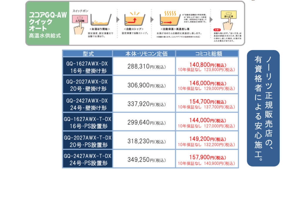 (10年修理保証付き)高温水供給式給湯器の交換キャンペーン!(マンション向けクイックオート) 2025年4月1日 商品も取替工事費もコミコミ おすすめ水栓です 超省エネで光熱費がとても安いハイブリッド給湯器