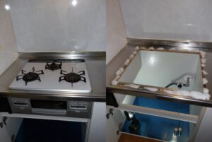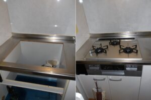 今回お客様より「ガスコンロで1か所だけ調子が悪いです。火はつきますが点火ボタンを離すと消えてしまいます。古いコンロなので交換をお願いしたい」とご相談いただきました。