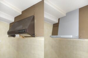 タカラスタンダードのブーツ形レンジフードより、ノーリツのスリム形ノンフィルターレンジフードへ