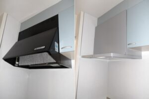 確認しますとブース型のレンジフードで音がかなり大きくなっておりました。オーナー様から新しく交換のご依頼をいただいておりましたので、ノンフィルタータイプのレンジフードをご提案させていただきました。こちらのレンジフードは面倒なフィルター掃除の手間がなく楽に汚れが落とせます。すっきりしたデザインでキッチンにもなじみやすく、多くのお客様よりスリム形ノンフィルターレンジフードへの交換をご依頼いただいております。